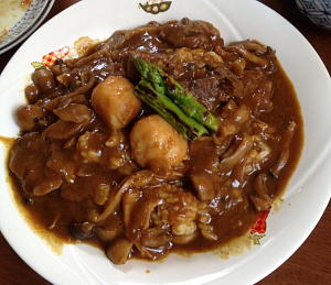 で、牛肉入りきのこカレー作るついでに、水煮里芋も入れ、焼きアスパラを載っけてみた。