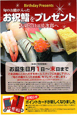 清治郎(北上店)から、お寿司のバースティ・プレゼント券が送られてきた。