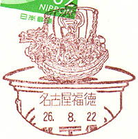 郵便局前に縁起のよい宝船と七福神を載っけた丸形ポストの設置されたことを機にデザインが変更された。