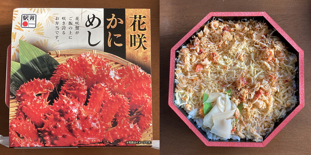 茶飯の上に味付けした花咲蟹のほぐしと錦糸卵を一面に散りばめた弁当。