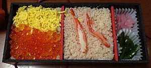海鮮丼ということか、酢飯の上にホッキのスライス、焼き鮭、ズワイガニのフレーク、イクラの醤油漬け。
