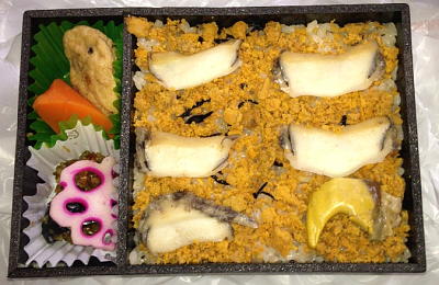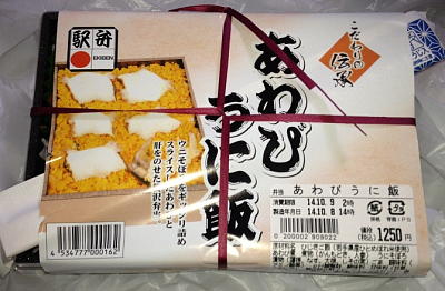 あわび、うに、とくれば、とぉっても贅沢感があると思うのだが、色合いのせいか、とてもシンプルな弁当に見えますな。