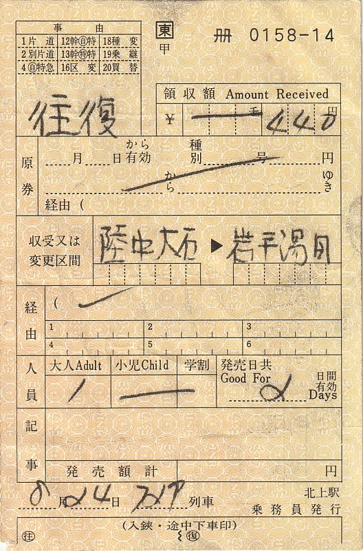 これは陸中大石駅と岩手湯田駅間の往復の補充券、ということですかね?