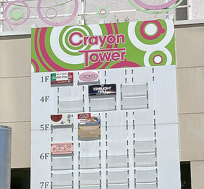 さて、通行止めの看板の横を見上げれば、、、クレヨンタワーの入居看板。