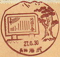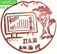 風景印には、集落センターの隣に設置されている「北国の春」の歌碑、県指定天然記念物のヒメコマツ(幹周4m)が描かれていた。