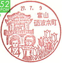 風景印には出町子供歌舞伎と曳山、チューリップ四季彩館のチューリップが描かれている。