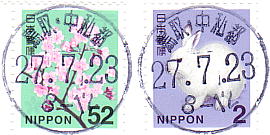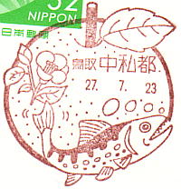 風景印には、二十世紀梨にウラクツバキの花とヤマメが描かれている。