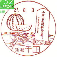 JPのHPには、『千田郵便局は小千谷市小粟田地区に所在し、戦後に工兵大隊跡地が開墾され農地となり、出荷されるものの代表として、稲穂とスイカ及び開拓記念碑を風景印のデザインとしました』とある。