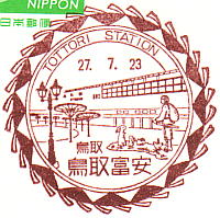 新印には、しゃんしゃん傘を枠に、JR鳥取駅南口が描かれている。