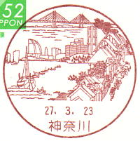 というふうにJPのHPでは風景印の説明がされていますが、神奈川宿の空の部分に、みなとみらいとベイブリッチが描かれている、んだよね。
