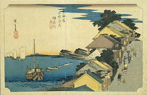 広重の東海道五拾三次旅景色「神奈川宿」の描画を背景に、現代のみなとみらい地区と横浜ベイブリッジが描かれている。