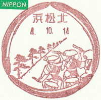 遠州浜松地方の特産品である「うなぎ」を3匹繋いで枠を形成し配し、郵便局のある北区内を縦断する浜松市指定史跡の「姫街道の松並木」と、浜松市無形民俗文化財である郷土芸能「遠州大念仏」が描かれている。