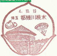花桃の実を枠(多分)に、ときがわ町唯一の鉄道駅にして関東の駅百選に選ばれたJR八高線の明覚駅、スクールもあるパラグライダー、みかん狩りが出来る大附みかんが描かれている。