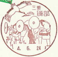 基本の丸枠に、左上から伊勢神宮の別宮・伊雑宮(いざわのみや)創建の由来とされる伝説の「稲穂をくわえた白真名鶴(しろまなづる)」を穂を落としに飛来する感じで配し、中央には日本三大御田植祭の一つで、国の重要無形民俗文化財「磯部の御神田(おみた)」の御田植神事の光景が描かれている。