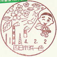 基本の丸型の枠に、四日市の特産品である萬古焼の土鍋を持ったこにゅうどうくん、海蔵川と川沿いにある桜、四日市のコンビナートが描描かれている。