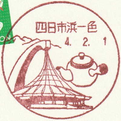 基本の丸枠に万古焼きのきゅうす、霞ケ浦緑地公園のオーストラリア記念館、湯の山の遠望が描かれていた。