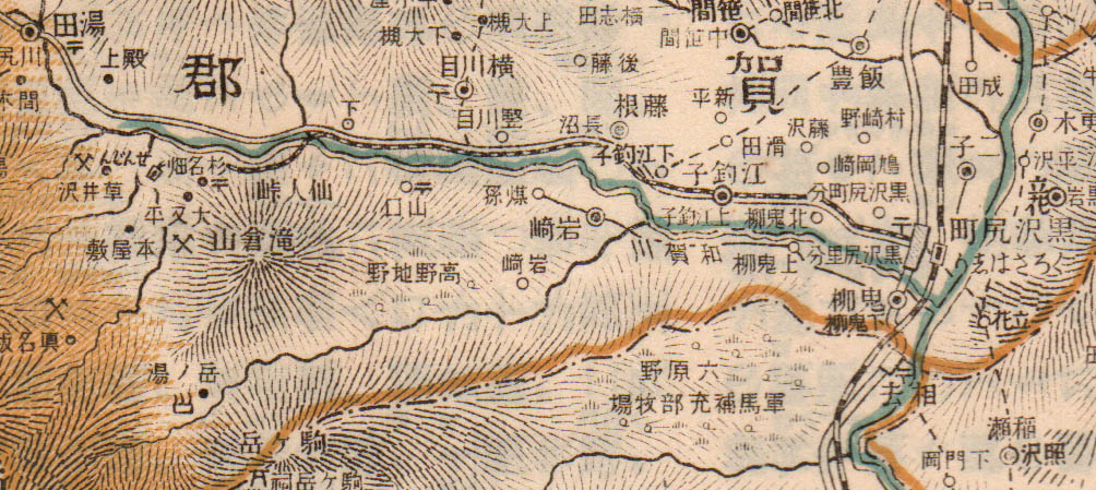 黑澤尻町人口六千餘を有する名邑(めいゆう)にして此地より北方を所謂昔の南部領たり、谷内村谷内に鎮する丹内山神社は多邇知比古命(たにちひろのみこと)を祭る處にして神代よりの舊社(きゅうしゃ)なりといふ、住吉蝦夷人の崇拜したる神にして境内の男杉女杉は頗る古く女杉の周り七丈二尺餘、男杉の周りは三尺四寸餘共に亭々として高く天を摩す、郡中に二温泉あり一は岩崎(いわざき)村字岩崎新田にありて瀬目(せのめ)温泉といひ、一は湯田村字湯本にありて湯田温泉といひ共に鹽類泉(えんるいせん)なり