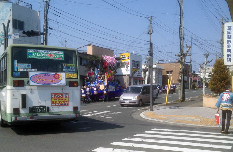 黒沢尻12区の山車がいるのに、お構いなしに侵入していくバス。