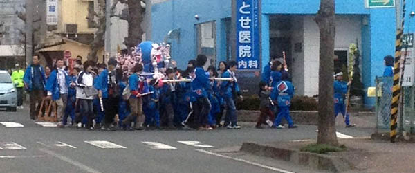 大通りちとせ医院(もと石川医院)前を駅方面に曲がる26区のドラえもん神輿。