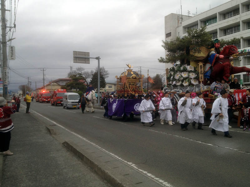市役所前で休憩中の6区の山車の前を通る諏訪神社の神輿、馬、消防車。