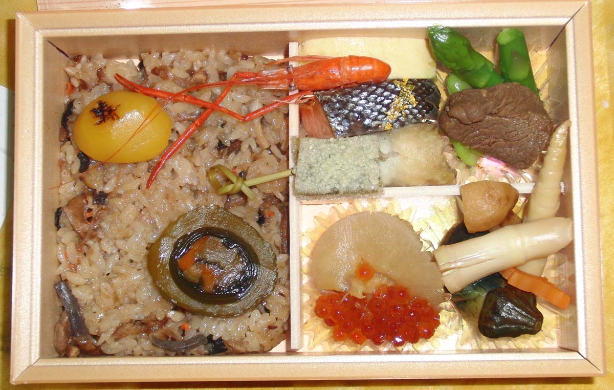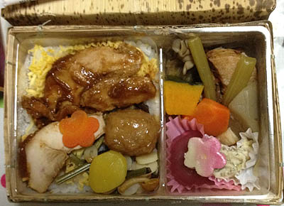 さて中身は、国産白飯の上に錦糸卵、鶏肉の味噌漬け焼き、鶏つくね、山菜漬け、栗の甘露煮、飾り人参。