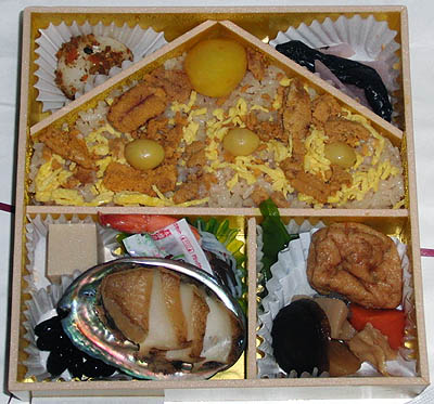 ウニ、栗、銀杏、錦糸卵で黄金を表現しているのでしょう、てっぺんの栗は宝珠で、銀杏三個は正面の扉か、藤原三代を表しているのだろうか。