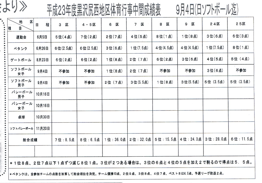 西地区交流センターのひまわりだよりに、ソフトボールまでの中間成績が載っていました。